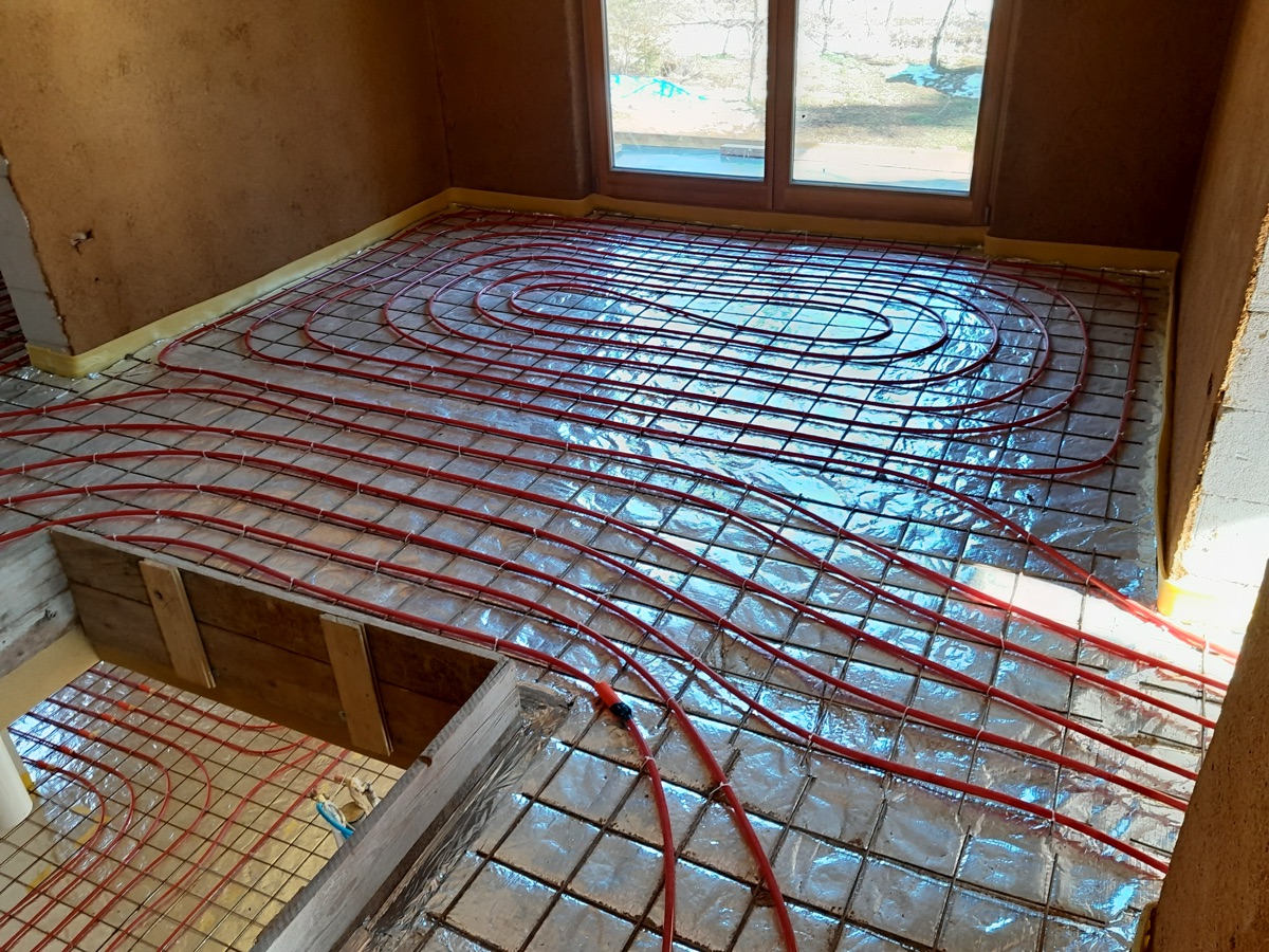Polaganje talnega gretja ter menjava radiatorjev in ventilov za učinkovito ogrevanje.